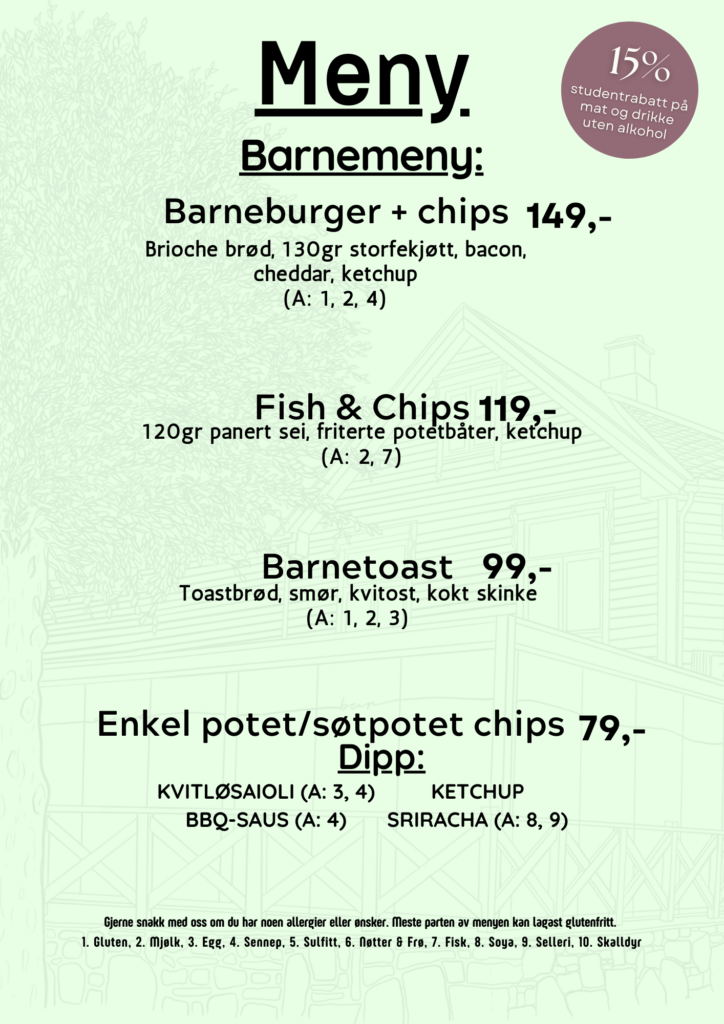 Som student får du 15% rabatt på alt av mat og drikke, uten alkohol!